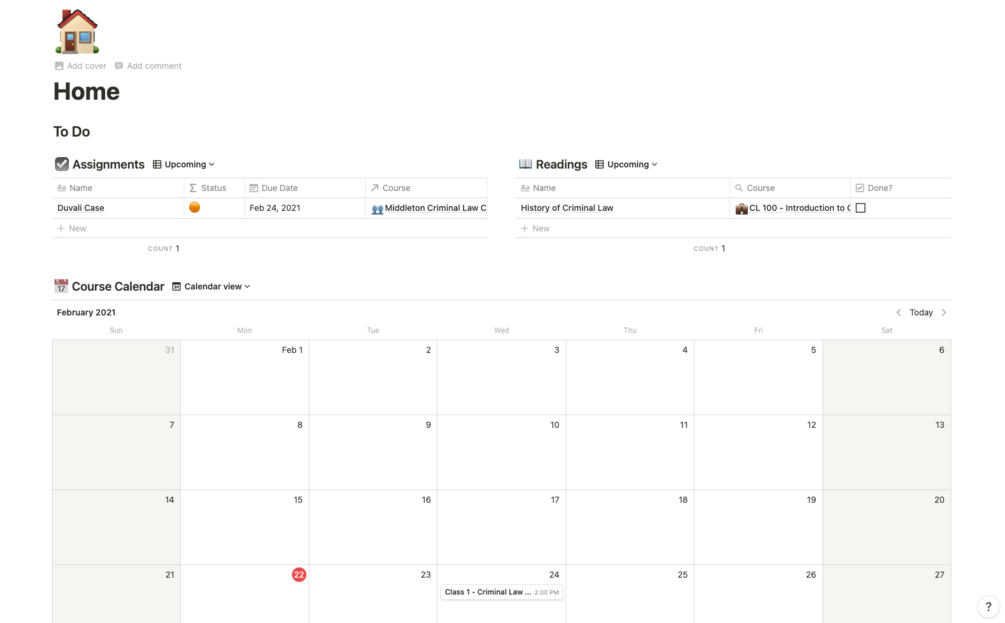 - A dashboard that gives you a quick glance at upcoming classes, assignments, and readings